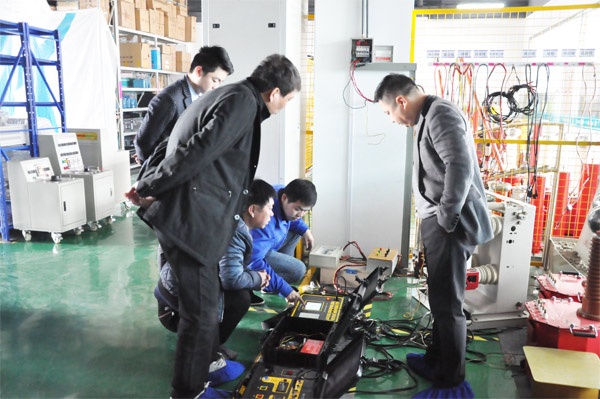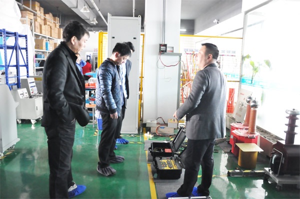 東北客戶此行主要考察SF6氣體回收裝置、無局部放電試驗(yàn)裝置、高壓開關(guān)動(dòng)特性測試儀等設(shè)備。 在考察過程中,工程師還為客戶進(jìn)行了設(shè)備操作的現(xiàn)場演示,在演示過程中,客戶時(shí)不時(shí)會(huì)提出他們的疑問,我們的工程師也很耐心的為其解答。通過一天的考察后,東北客戶對(duì)國電西高的設(shè)備十分滿意,表示有合作意向。