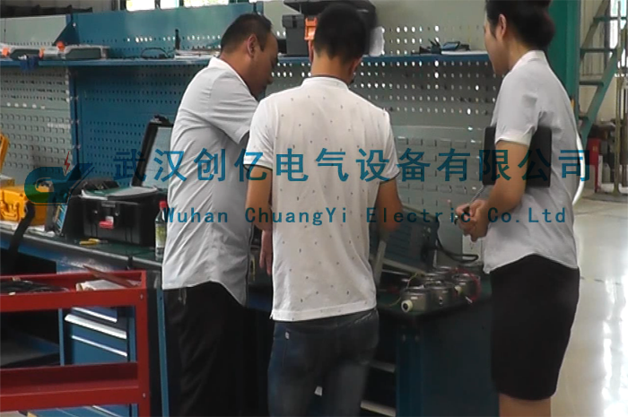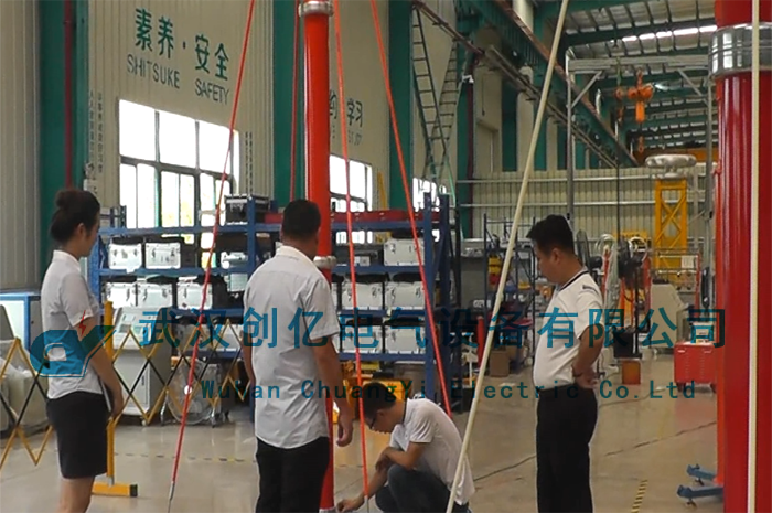 在客戶抵達武漢的前兩天,我司技術人員便率先架設起了這套串諧裝置進行最后的調(diào)試。客戶抵達武漢后,首先前往我司廠房進行驗貨和操作學習。客戶抵達我司生產(chǎn)廠房后,徑直開始學習設備。在設置好試驗防護欄后,儀器開始升壓。