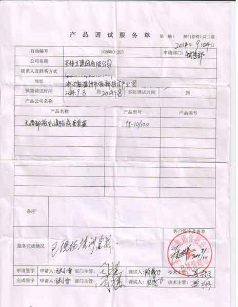 2014-10-09  浙江圣特立電氣有限公司進(jìn)行調(diào)試服務(wù),調(diào)試產(chǎn)品:CYYT-10/100無局部放電試驗(yàn)成套裝置  CYYT-10/100、無局部放電試驗(yàn)成套裝置1070420201