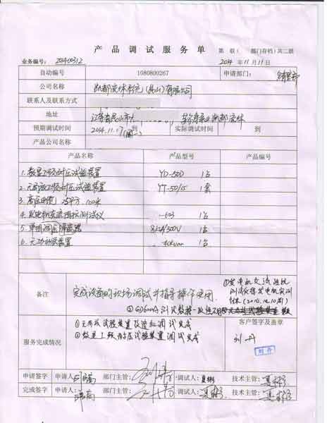 2014-11-19 昆山凱都流體泵業(yè)有限公司進(jìn)行調(diào)試服務(wù),調(diào)試產(chǎn)品:CYYD-50D、50kVA、數(shù)顯工頻耐壓試驗(yàn)控制臺 CYYT-50/15無局放工頻耐壓試驗(yàn)裝置 CYYT-50/15、無局放工頻耐壓試驗(yàn)裝置控制臺G0920141929 CY-603發(fā)電機(jī)交流阻抗測試儀 CY-40Kvar 無功補(bǔ)償裝置 CY6000A異頻介質(zhì)損耗測試儀