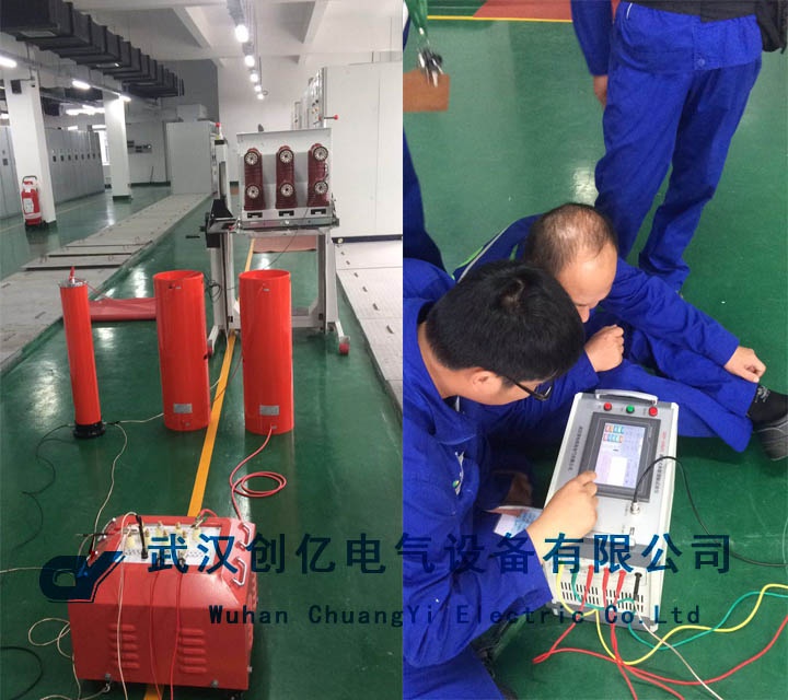我司技術(shù)人員抵達(dá)客戶處后,首先進(jìn)行試驗(yàn)內(nèi)容和工作原理的講解,然后進(jìn)行現(xiàn)場試驗(yàn)。先斷開高壓開關(guān)電源,斷開高壓開關(guān)電源,抽出高開本體就位,保留足夠安全距離,被試品可靠接地;配合被試品規(guī)格,計(jì)算出試驗(yàn)電壓電流、被試品電容和電抗器容量、大概諧振頻率,繼而推算電抗器的使用節(jié)數(shù)和接線方式,本試驗(yàn)采用4節(jié)電抗器串聯(lián)接線,變頻電源電壓檔3KV;進(jìn)行試驗(yàn),在試驗(yàn)過程中,指導(dǎo)客戶操作并對每個(gè)界面進(jìn)行講解,最后強(qiáng)調(diào)注意事項(xiàng)。
