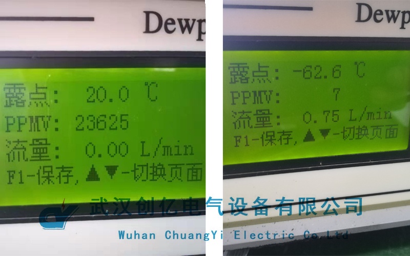 CYWS-242 SF6微水測量儀進行檢測時,先用高純氮清洗測量管道,通過調(diào)節(jié)測量管道上的針型閥,流量調(diào)節(jié)到0.75L/min,測出數(shù)據(jù):7ppmv;后續(xù)還對SF6新氣微水值也做了同樣測量,得出結(jié)果為11ppmv。兩項試驗均符合標(biāo)準(zhǔn)。