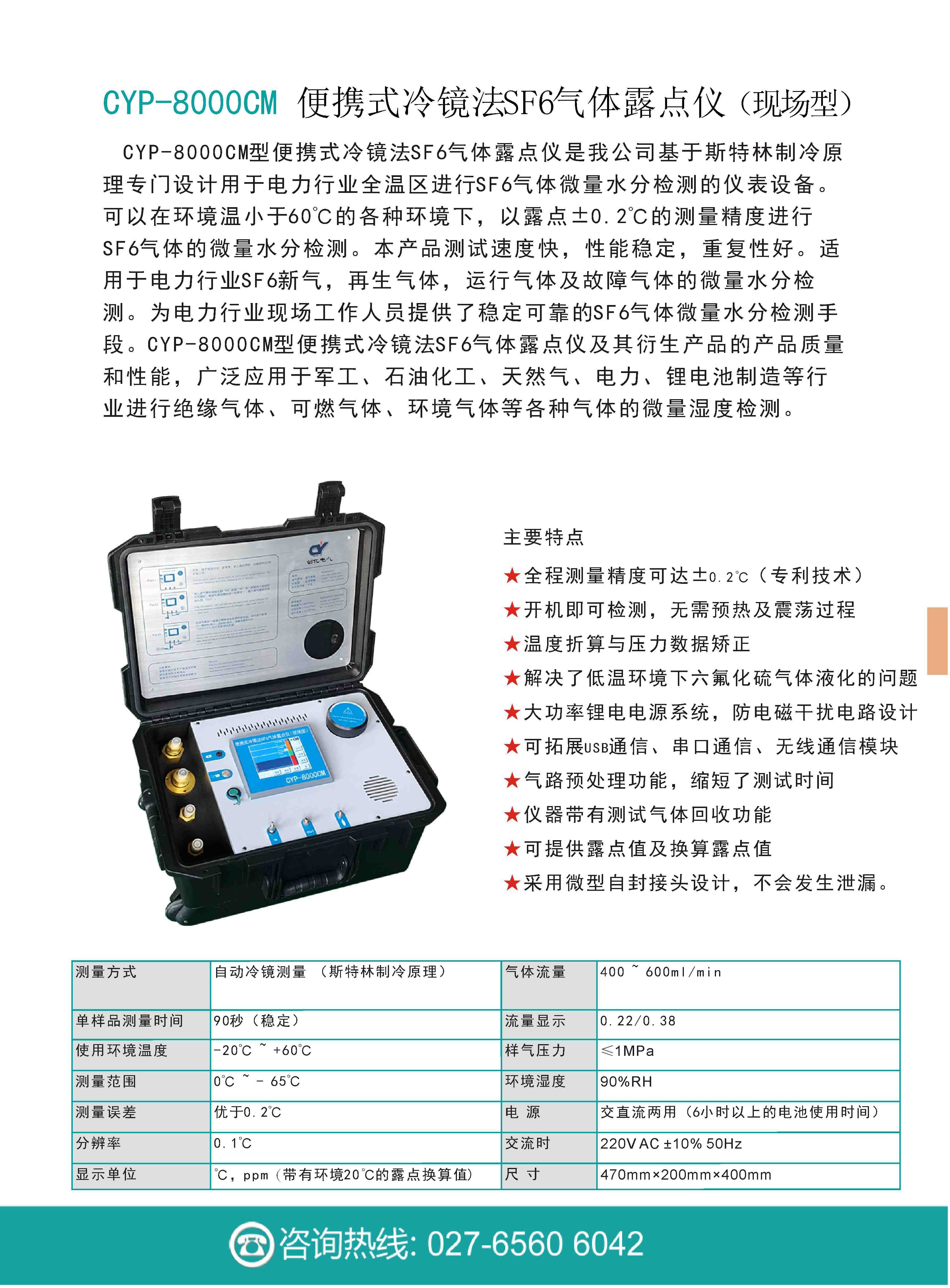 便攜式冷鏡法SF6氣體露點(diǎn)儀是我公司基于斯特林制冷原理專(zhuān)門(mén)設(shè)計(jì)用于電力行業(yè)全溫區(qū)進(jìn)行SF6氣體微量水分檢測(cè)的儀表設(shè)備??梢栽诃h(huán)境溫小于60℃的各種環(huán)境下,以露點(diǎn)±0.2℃的測(cè)量精度進(jìn)行SF6氣體的微量水分檢測(cè)。本產(chǎn)品測(cè)試速度快,性能穩(wěn)定,重復(fù)性好。適用于電力行業(yè)SF6新氣,再生氣體,運(yùn)行氣體及故障氣體的微量水分檢測(cè)。為電力行業(yè)現(xiàn)場(chǎng)工作人員提供了穩(wěn)定可靠的SF6氣體微量水分檢測(cè)手段。便攜式冷鏡法SF6氣體露點(diǎn)儀及其衍生產(chǎn)品以其優(yōu)異的產(chǎn)品質(zhì)量和性能,廣泛應(yīng)用于軍工、石油化工、天然氣、電力、鋰電池制造等行業(yè)進(jìn)行絕緣氣體、可燃?xì)怏w、環(huán)境氣體等各種氣體的微量濕度檢測(cè)。