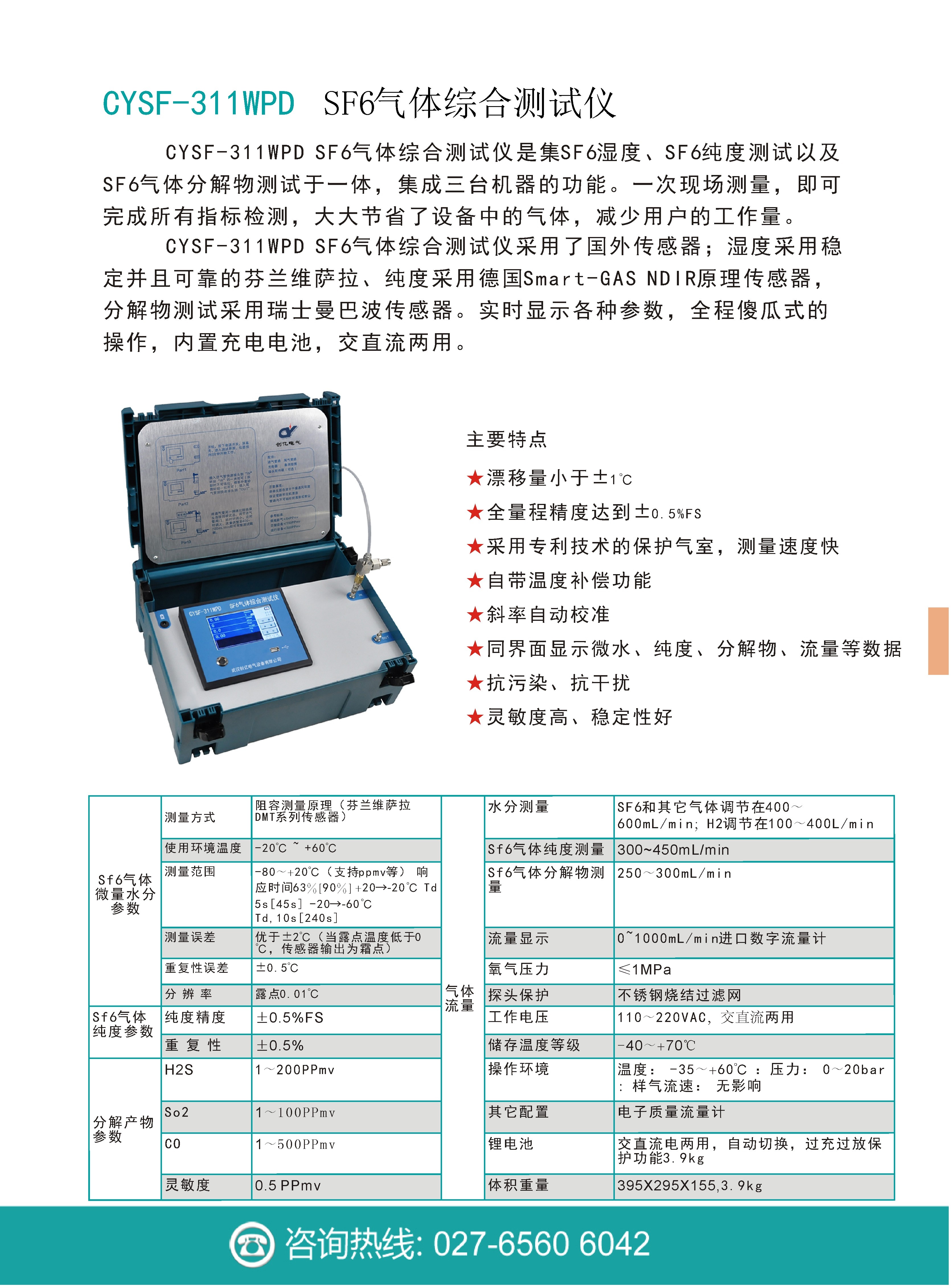 CYSF-311WPD SF6氣體綜合測(cè)試儀是集SF6濕度、SF6純度測(cè)試以及SF6氣體分解物測(cè)試于一體,將原來(lái)要用三臺(tái)儀器才能實(shí)現(xiàn)的功能,集中在一臺(tái)儀器。一次現(xiàn)場(chǎng)測(cè)量,即可完成所有指標(biāo)檢測(cè),大大節(jié)省了設(shè)備中的氣體,同時(shí)減少用戶的工作量,提高了工作效率。