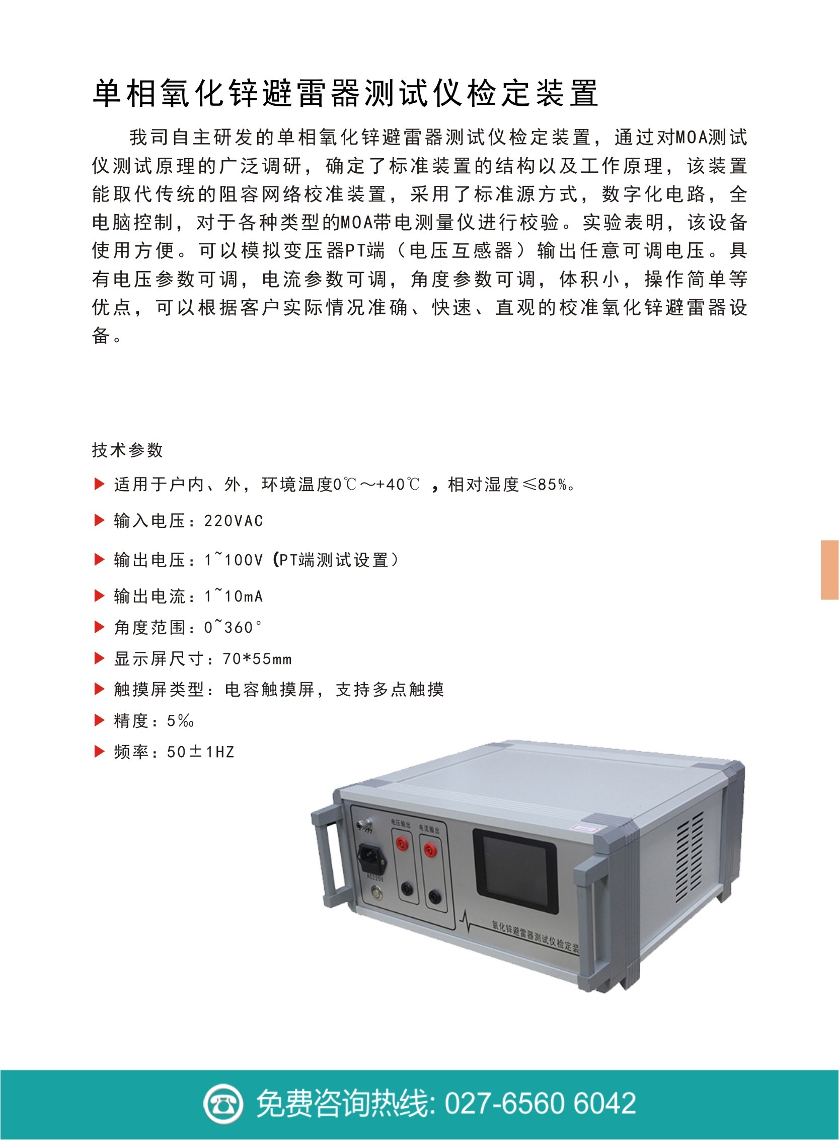 創(chuàng)億電氣自主研發(fā)的CY-301單相氧化鋅避雷器測(cè)試儀檢定裝置,通過對(duì)MOA測(cè)試儀測(cè)試原理的廣泛調(diào)研,確定了標(biāo)準(zhǔn)裝置的結(jié)構(gòu)以及工作原理,該裝置能取代傳統(tǒng)的阻容網(wǎng)絡(luò)校準(zhǔn)裝置,采用了標(biāo)準(zhǔn)源方式,數(shù)字化電路,全電腦控制,對(duì)于各種類型的MOA帶電測(cè)量?jī)x進(jìn)行校驗(yàn)。實(shí)驗(yàn)表明,該設(shè)備使用方便??梢阅M變壓器PT端(電壓互感器)輸出任意可調(diào)電壓。具有電壓參數(shù)可調(diào),電流參數(shù)可調(diào),角度參數(shù)可調(diào),體積小,操作簡(jiǎn)單等優(yōu)點(diǎn),可以根據(jù)客戶實(shí)際情況準(zhǔn)確、快速、直觀的校準(zhǔn)氧化鋅避雷器設(shè)備。