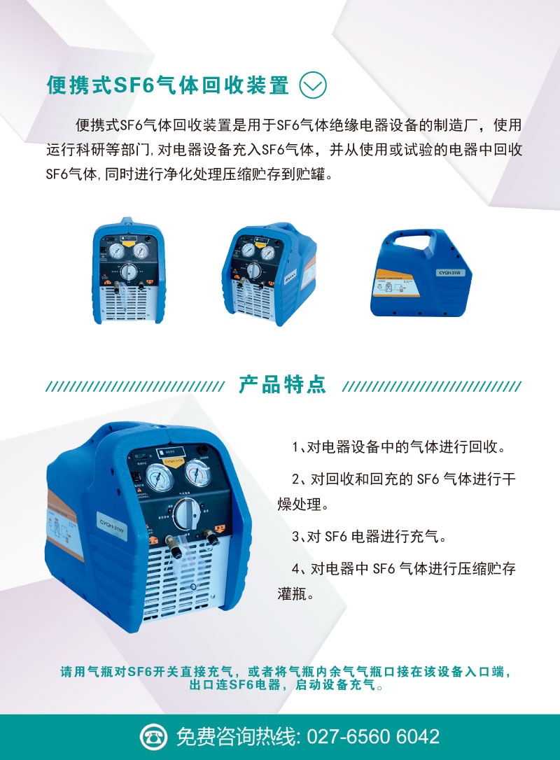 CYQH-31W便攜式SF6氣體回收裝置是用于SF6氣體絕緣電器設(shè)備的制造廠,使用運行科研等部門,對電器設(shè)備充入SF6氣體,并從使用或試驗的電器中回收SF6氣體,同時進行凈化處理壓縮貯存到貯罐。