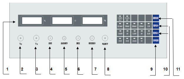 10— 額定電壓選擇按鍵。該按鍵必須和上圖中標(biāo)號(hào)為9的按鍵組合使用,使設(shè)定的電壓與實(shí)際所測(cè)量的電子式電流(或電壓)互感器額定二次電壓相一致。